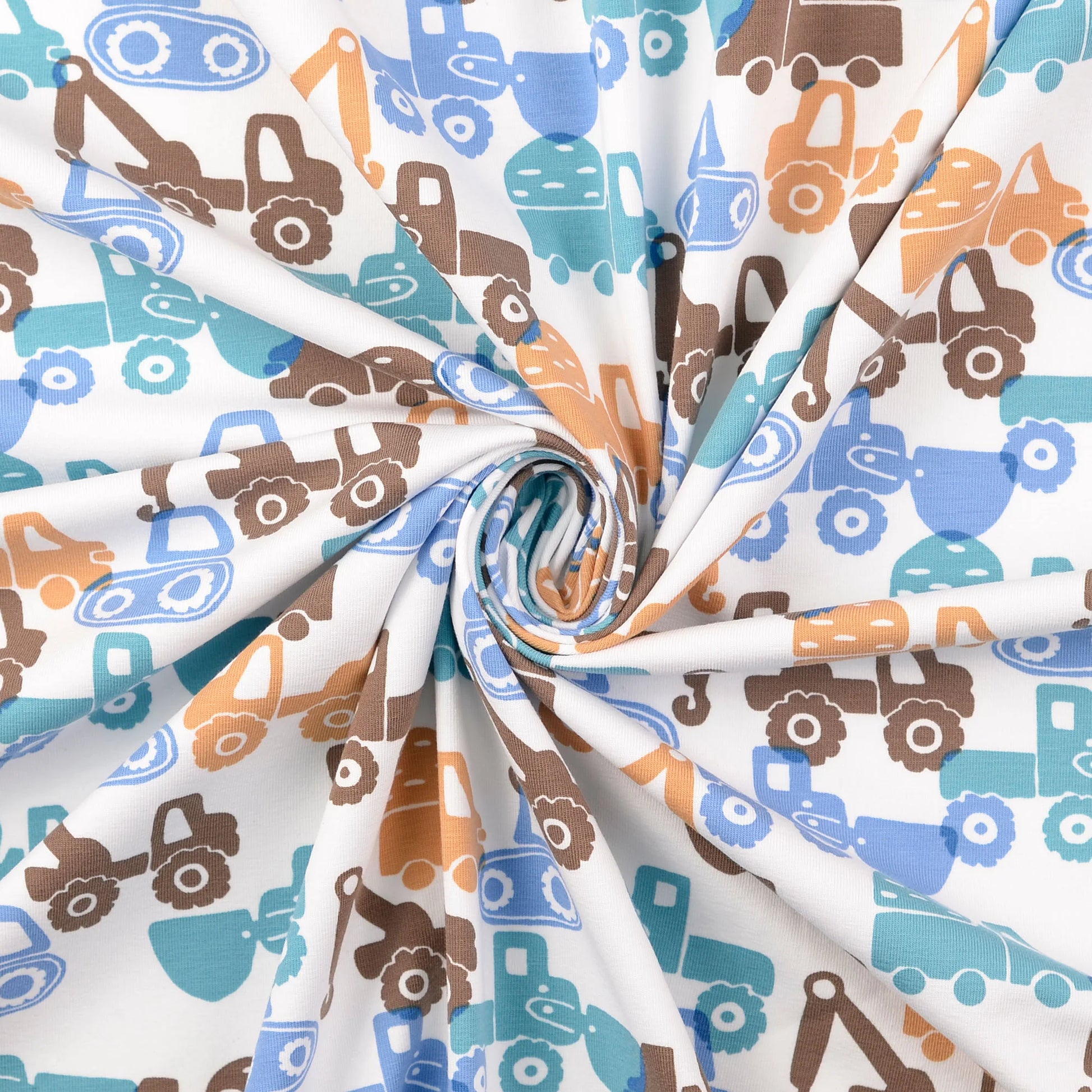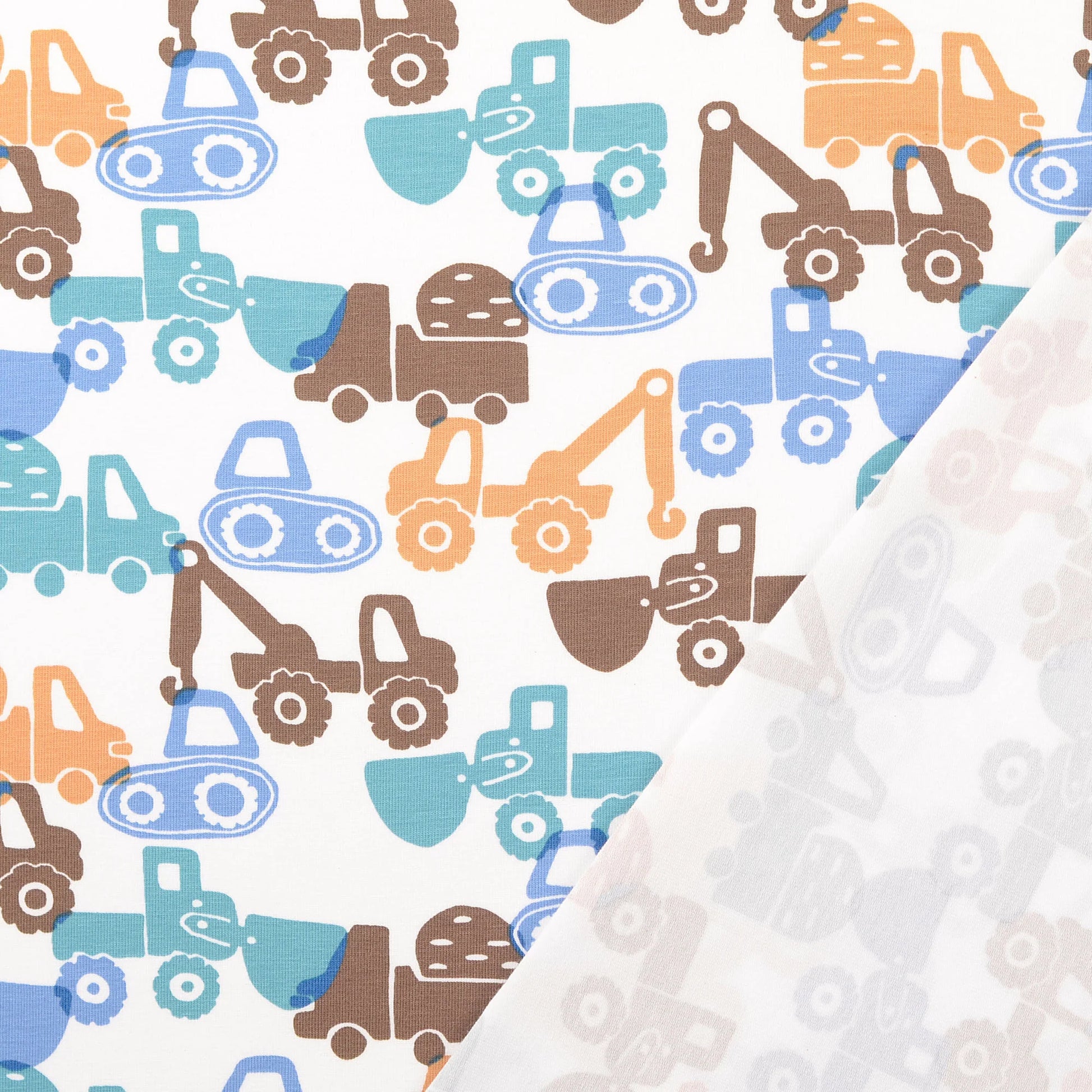 Ein Muss für kleine Baustellen-Fans: Dieser Baumwolljersey zeigt ein lebendiges Muster aus verschiedenen Baufahrzeugen in den Farben ocker, blau und braun. Ob Auto, Laster oder Kipper – das Design begeistert mit seiner detailreichen Darstellung und macht jedes Nähprojekt zum Hingucker.