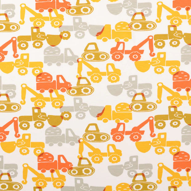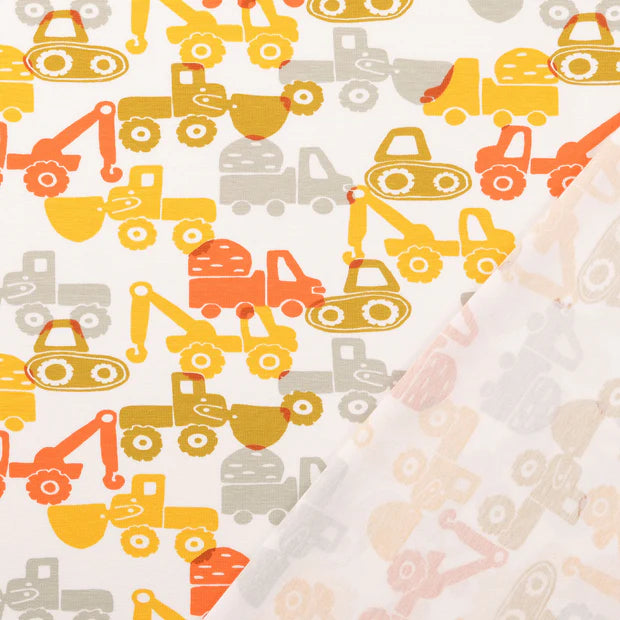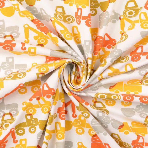 Baumwolle Jersey "Baufahrzeuge" senf