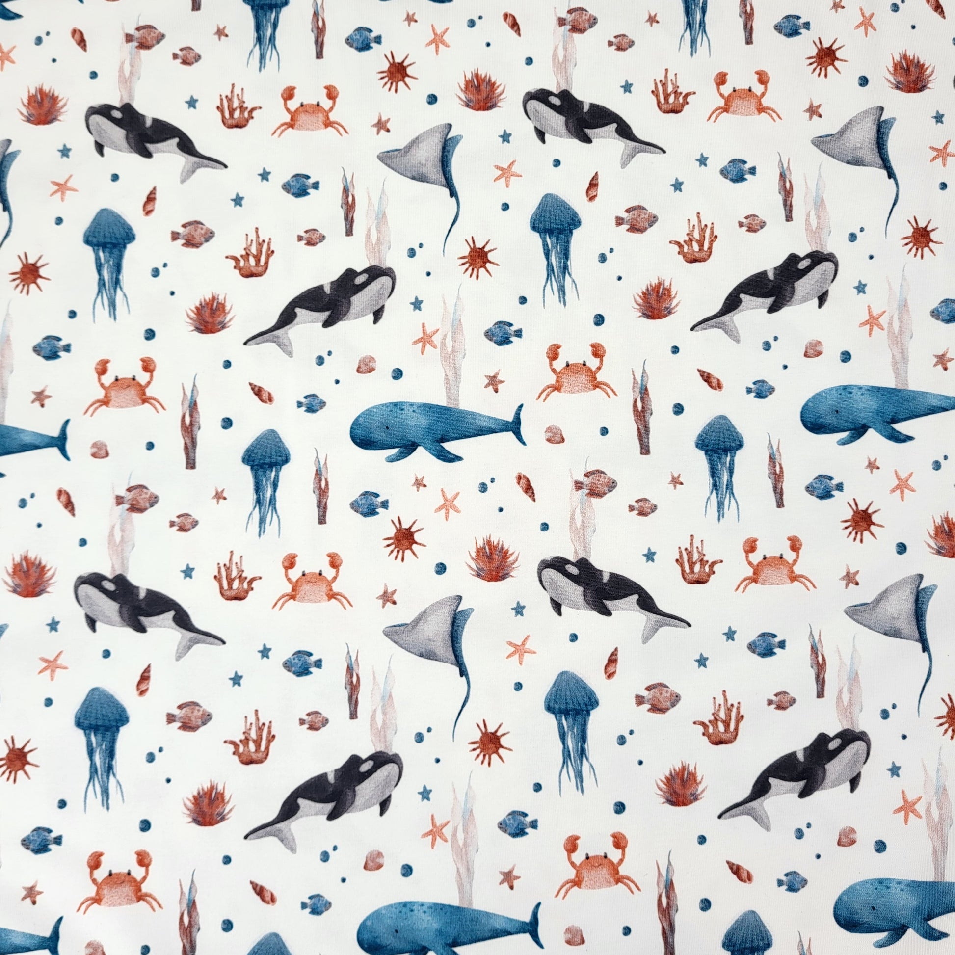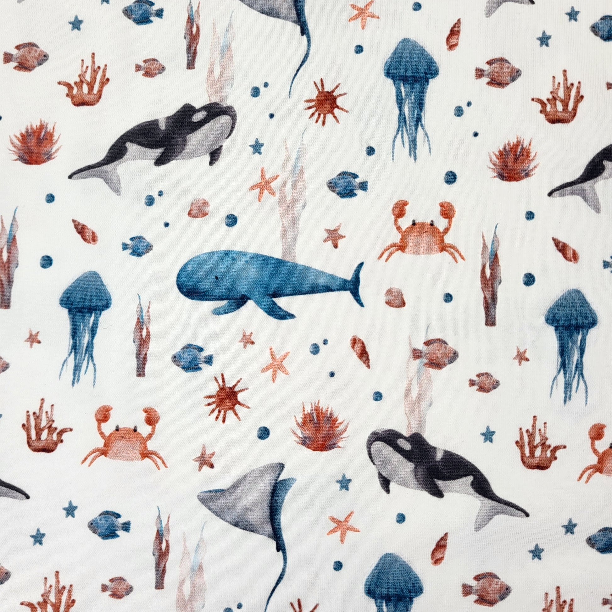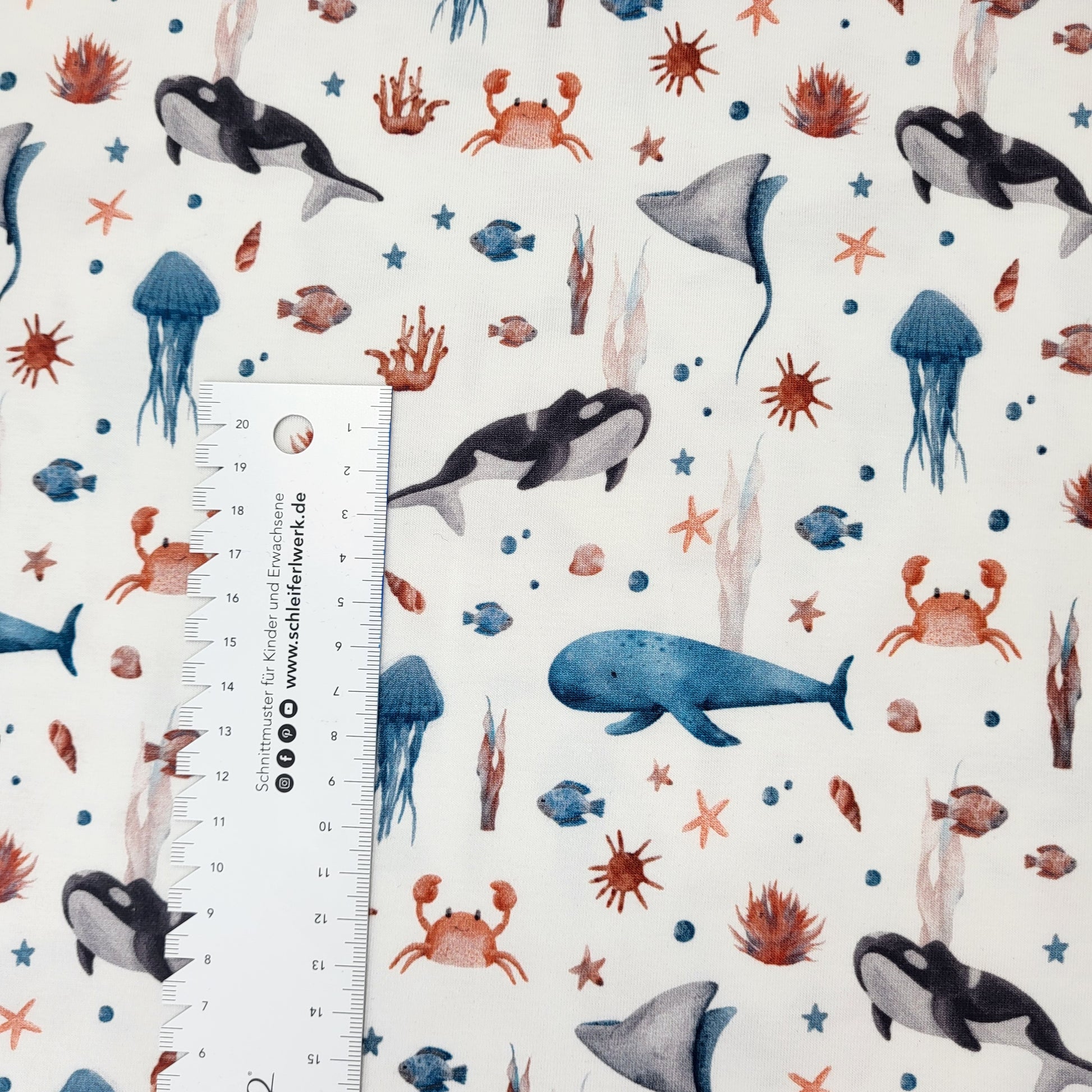 Tauche ein in die faszinierende Welt unter Wasser! Unser hochwertiger Jersey aus exklusiver Eigenproduktion begeistert mit einem liebevoll gestalteten Motiv aus verschiedenen Meerestieren – präsentiert auf einem klaren, weißen Hintergrund, der die Farben besonders strahlend zur Geltung bringt.
