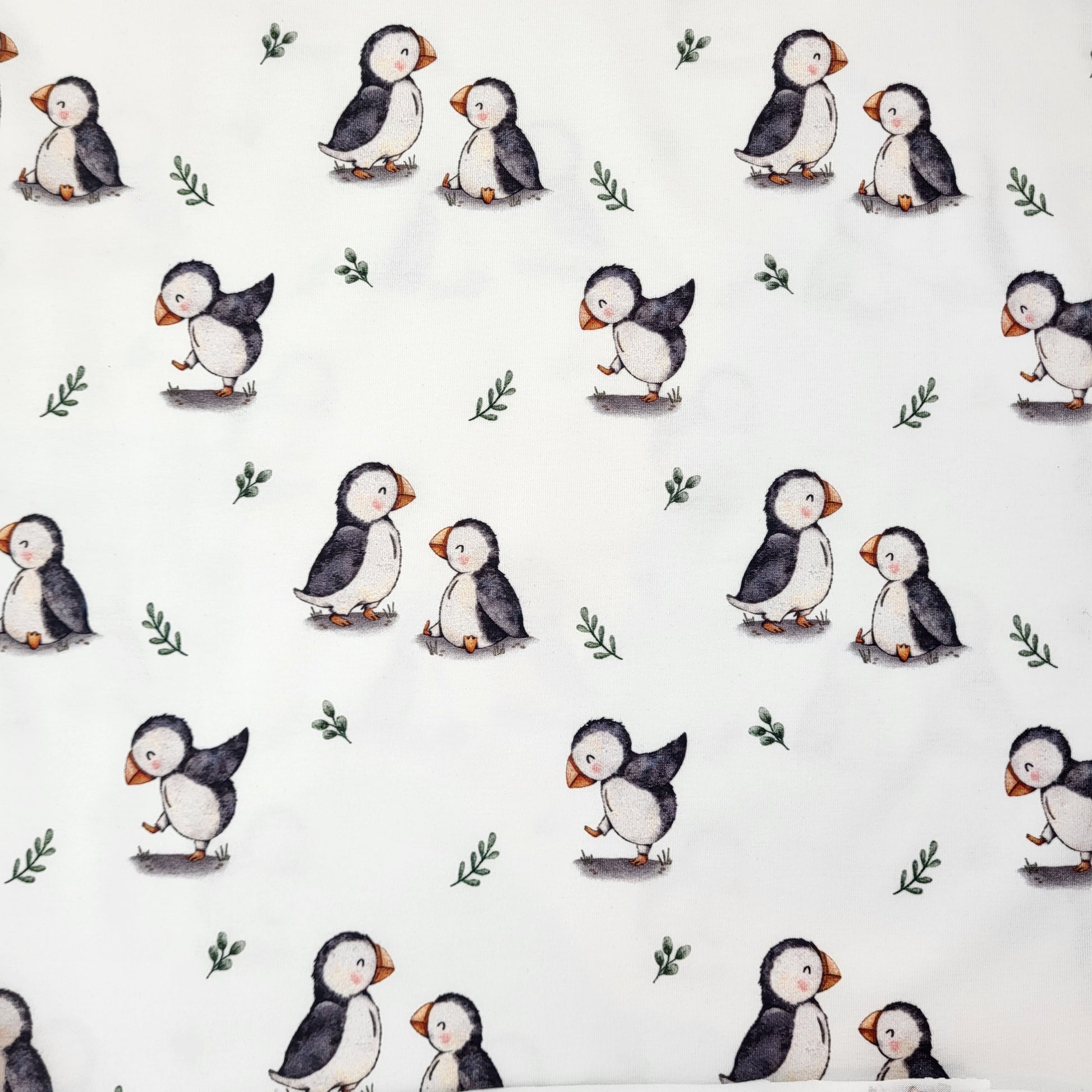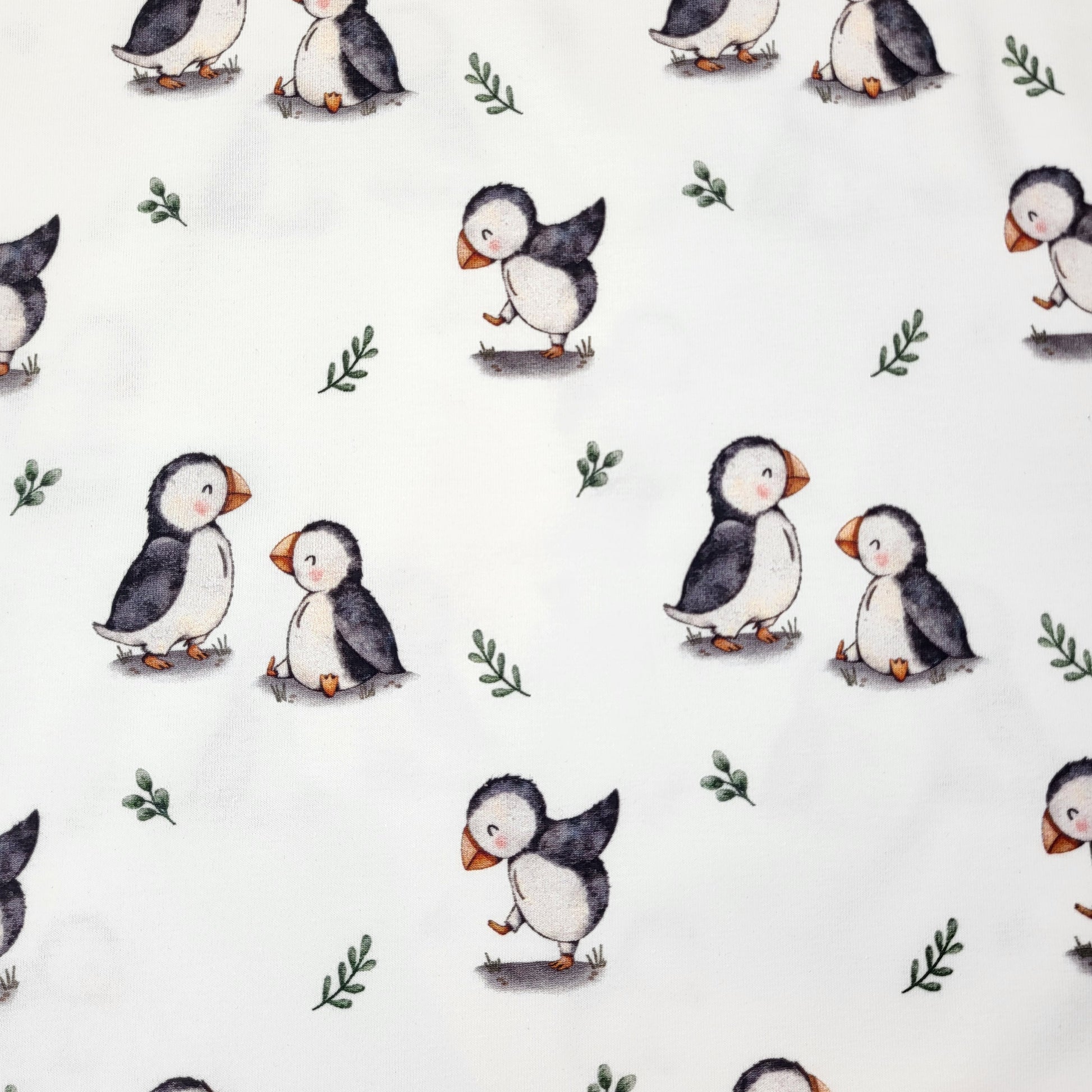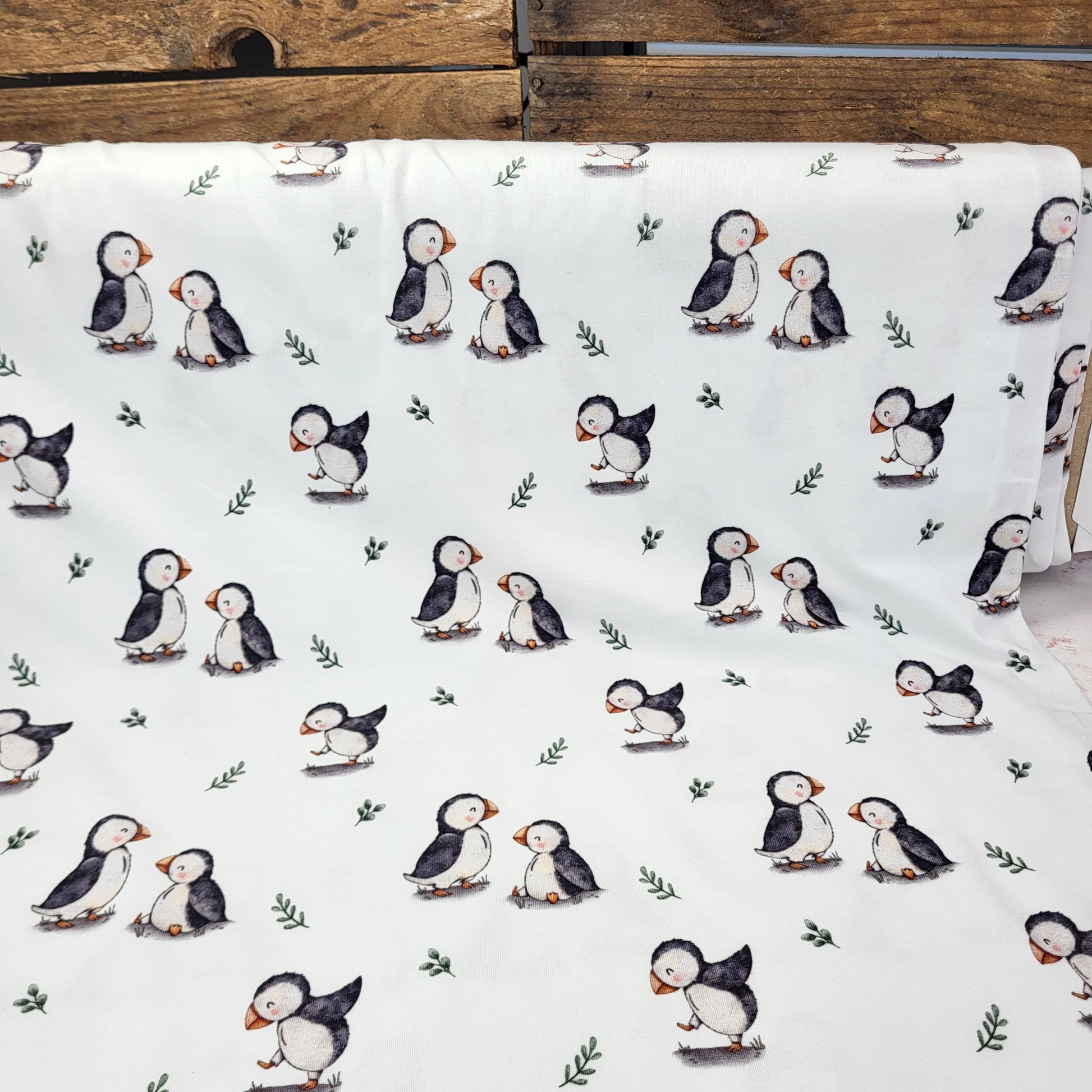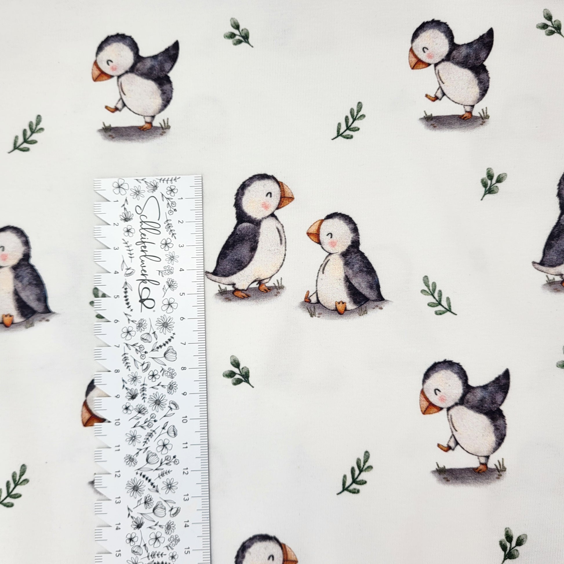 Entdecke die zauberhafte Welt der Papageitaucher! Unser exklusiver Eigenproduktions-Jersey begeistert mit süßen, fröhlichen Papageitaucher, die mit ihren charakteristischen bunten Schnäbeln und knuffigen Körperformen sofort gute Laune verbreiten. Das liebevoll gestaltete Motiv macht diesen Stoff zu einem echten Highlight für kleine und große Naturfreunde.