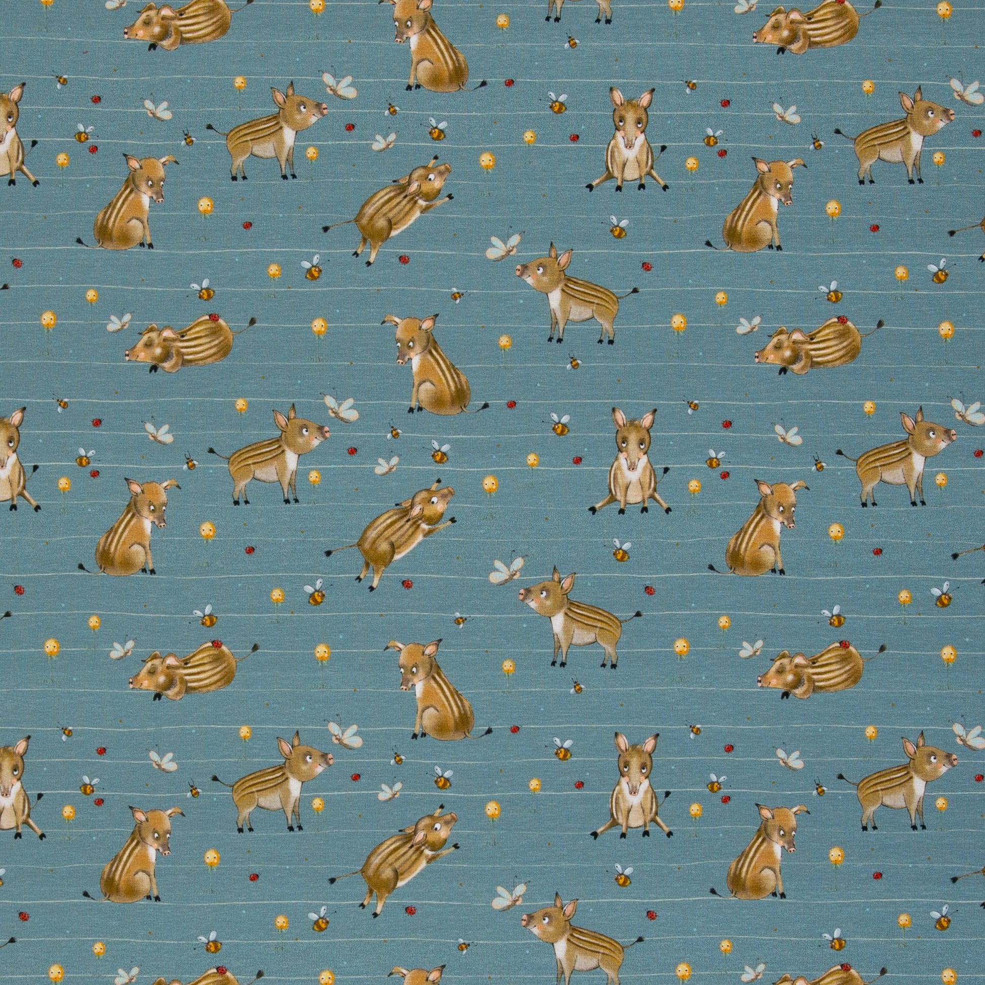 Dieser zuckersüße Baumwolljersey verzaubert mit einem einzigartigen Motiv: niedliche kleine Frischlinge, die fröhlich mit Bienen und Marienkäfern spielen.
