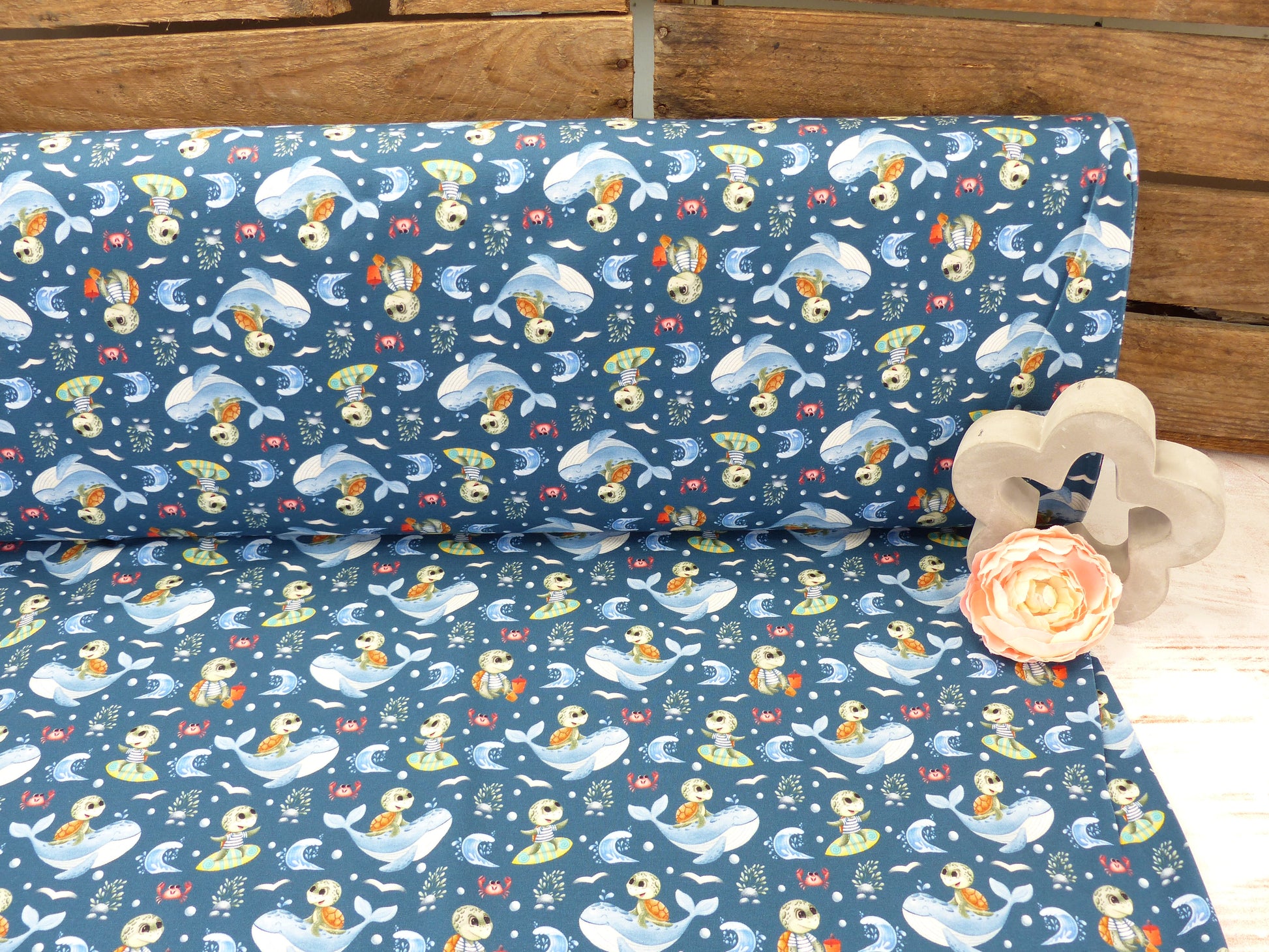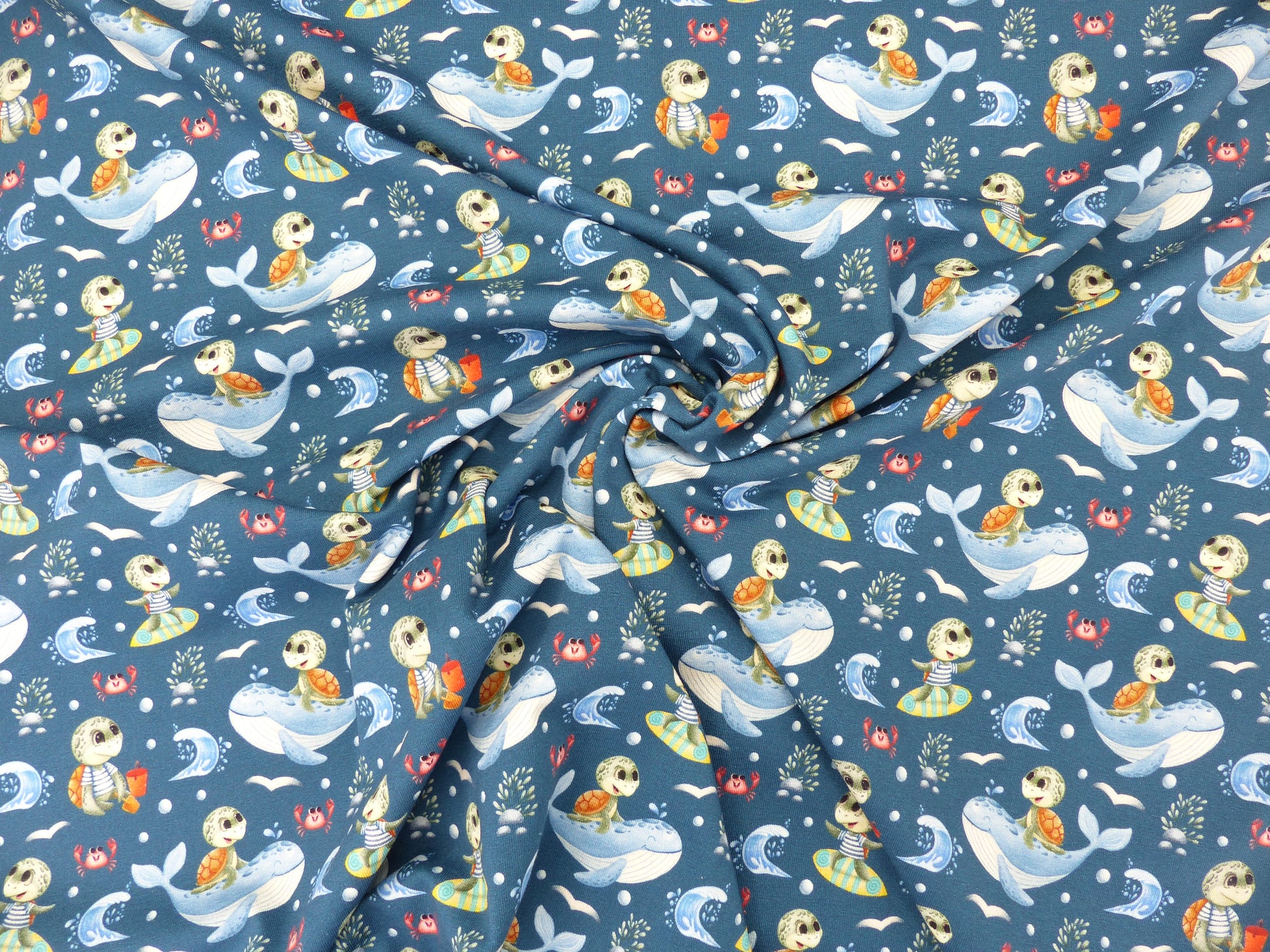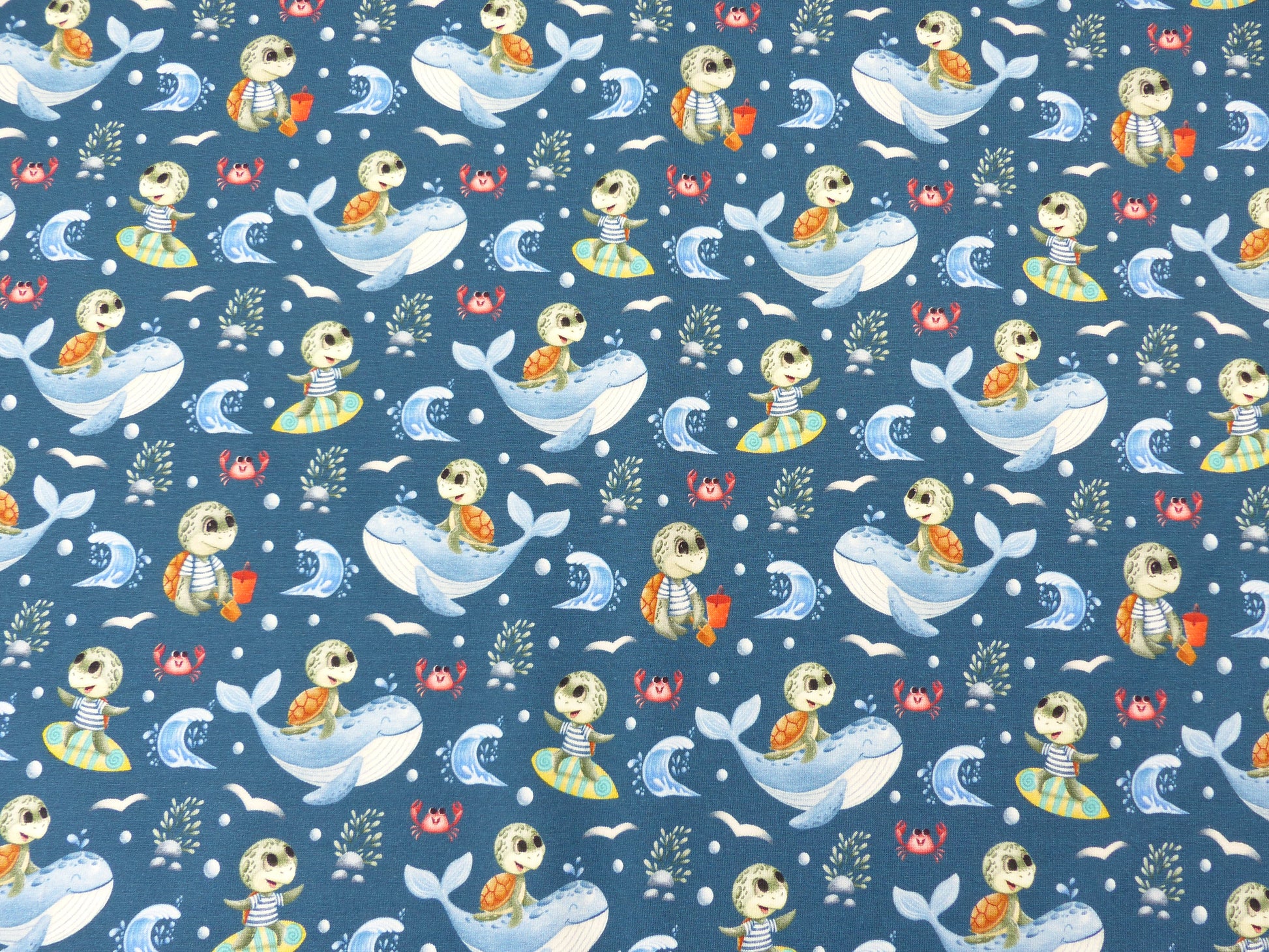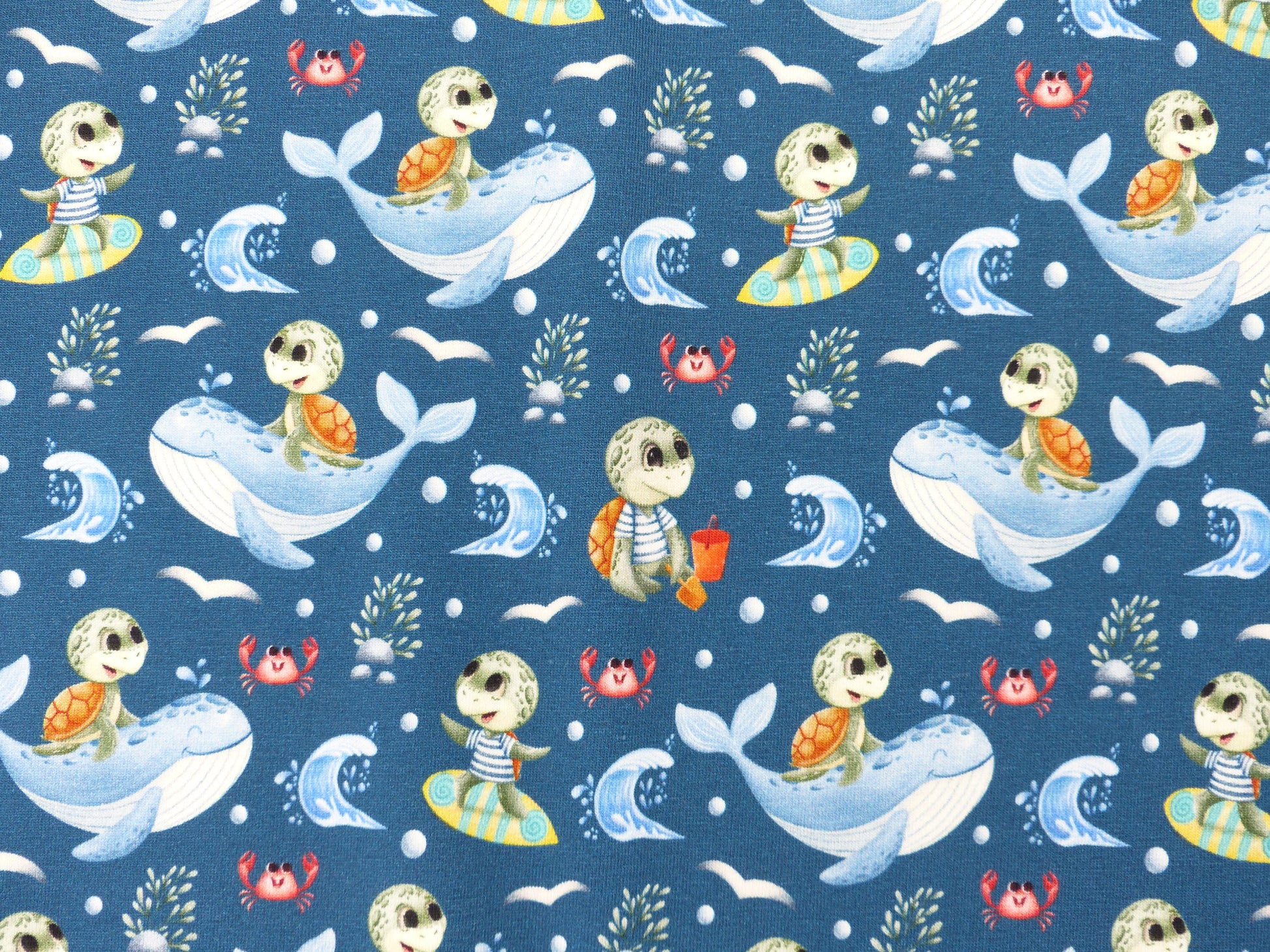 - Design: Muster mit süßen Schildkröten, die surfen oder auf einem Wal reiten