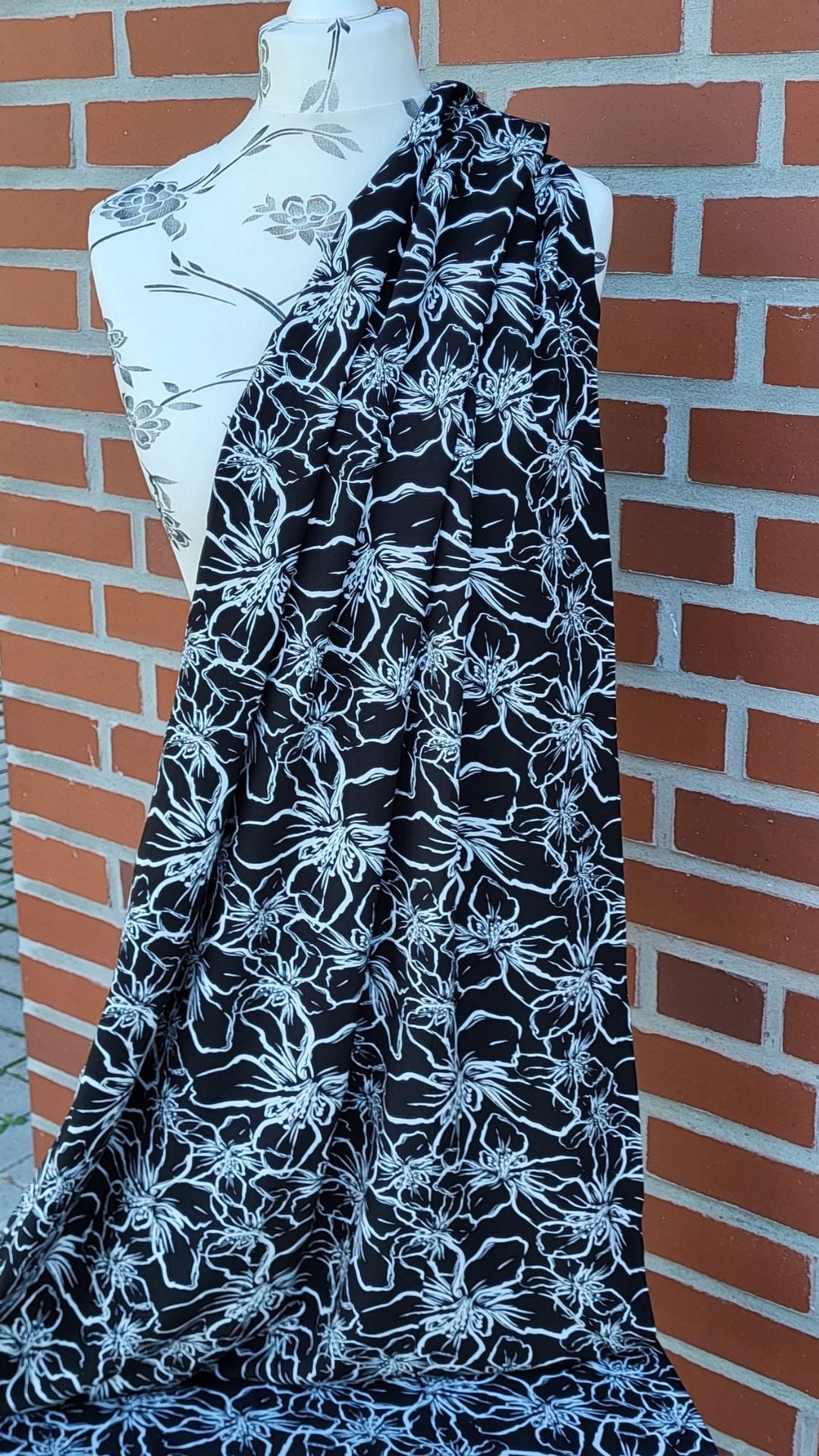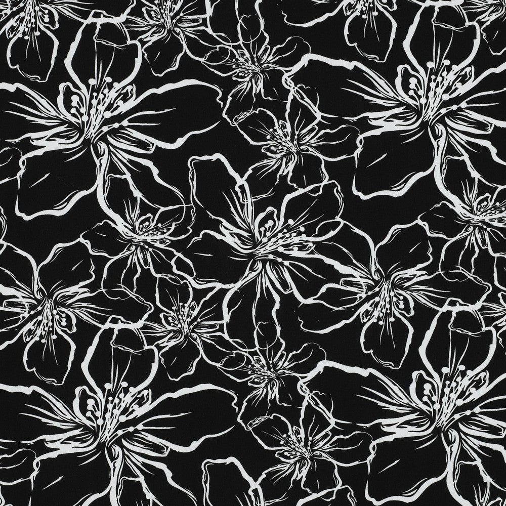 Dieser nachhaltige Lenzing™ ECOVERO™ Stoff beeindruckt mit einem zeitlos schönen Blumenmuster in reinem Weiß auf klassisch schwarzem Hintergrund. Der Stoff ist angenehm weich, fließend und überzeugt durch seine umweltschonende Herstellung. Ideal für alle, die Wert auf stilvolles Design und verantwortungsbewusste Materialien legen.
