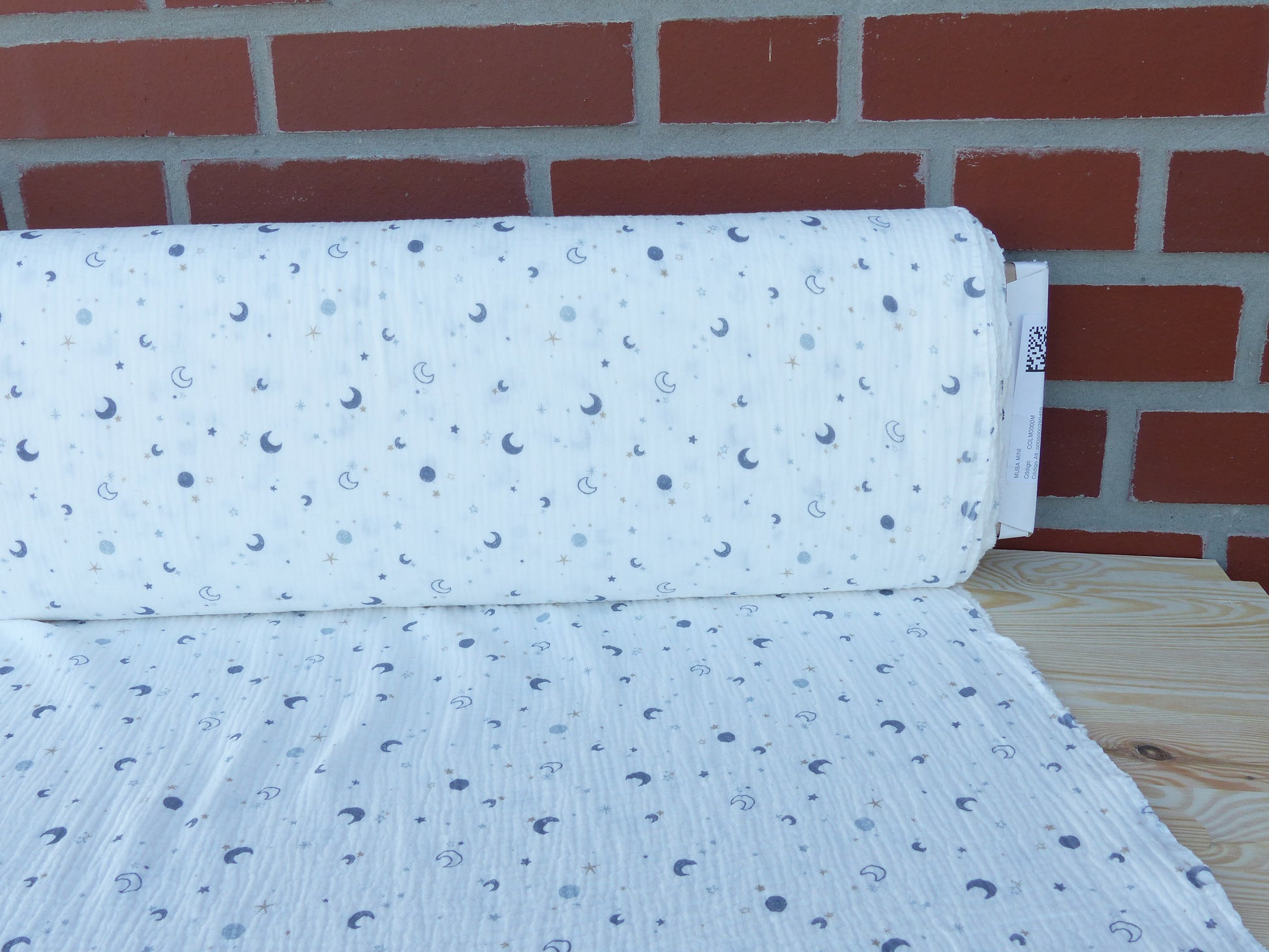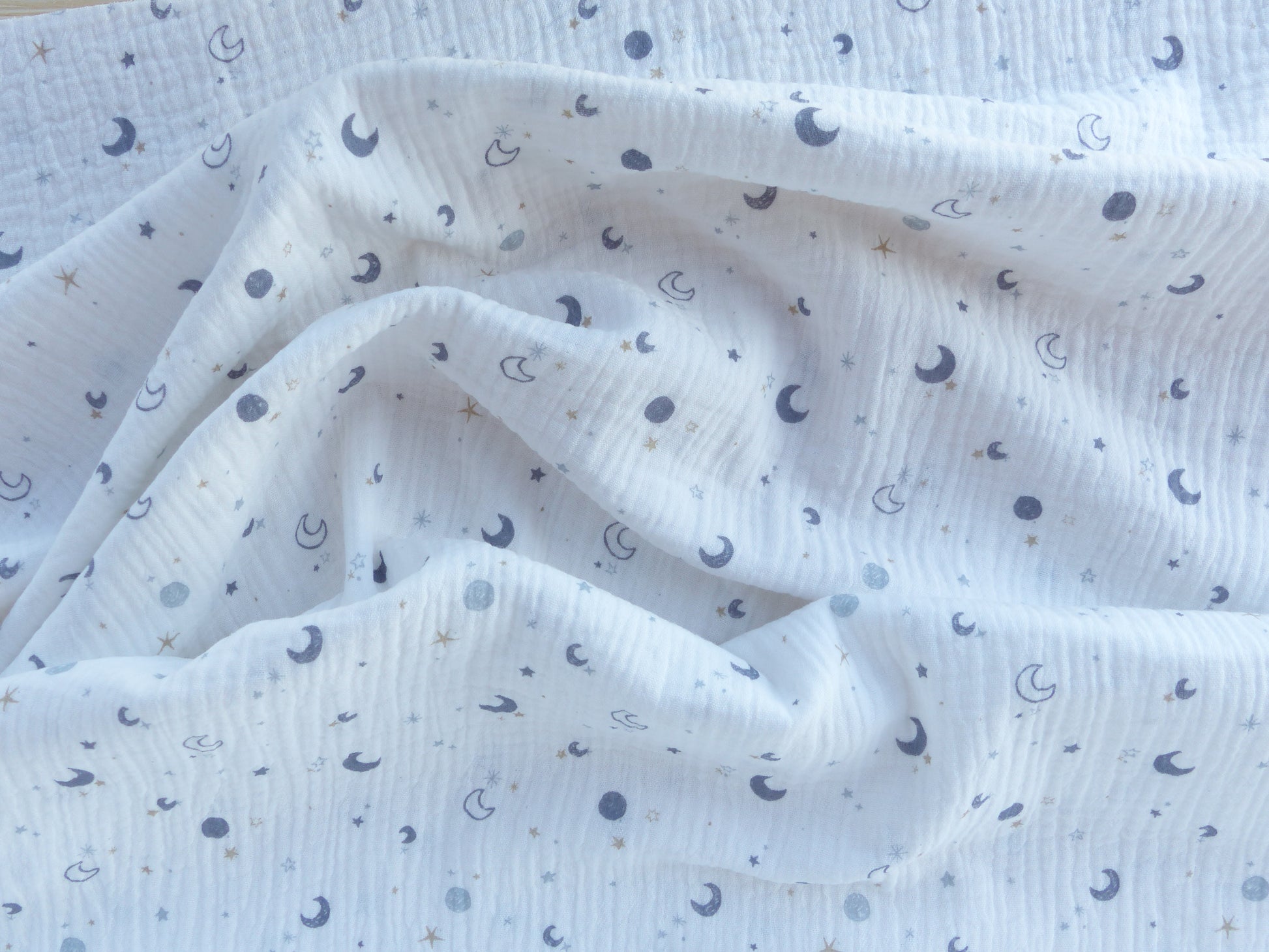 Dieser besondere Musselin begeistert mit einem zarten Mini-Print aus kleinen Monden, die sich dezent und gleichmäßig über den Stoff verteilen. Das feine Motiv verleiht dem Design eine ruhige, harmonische Ausstrahlung und sorgt gleichzeitig für einen modernen, leicht verspielten Look.