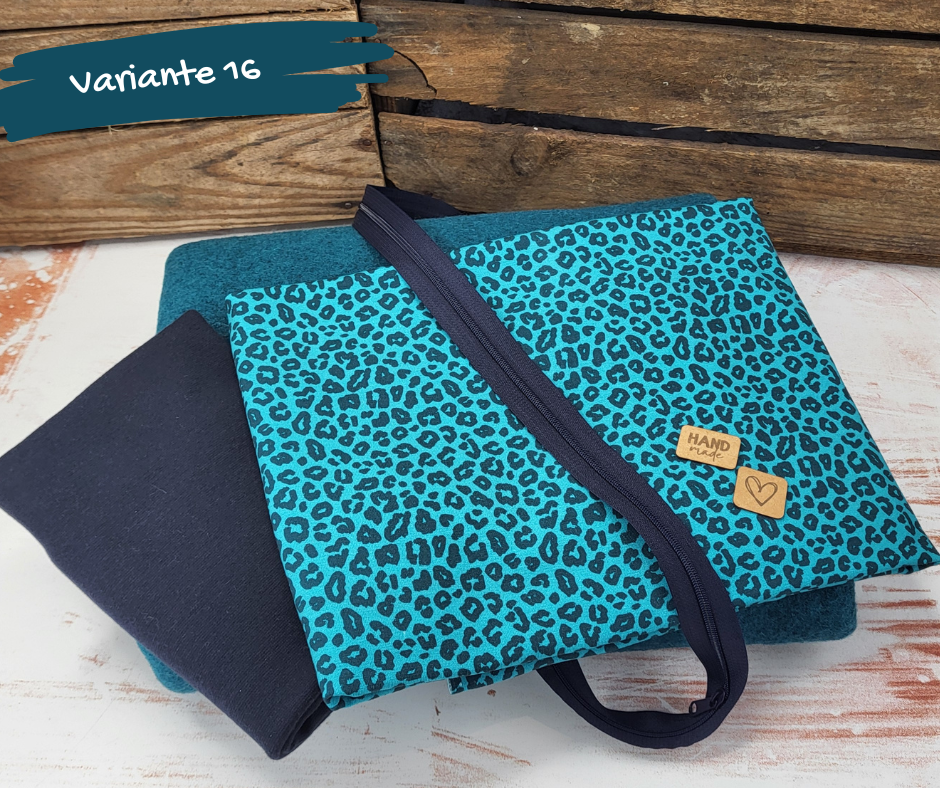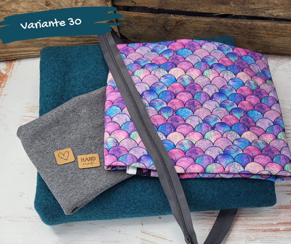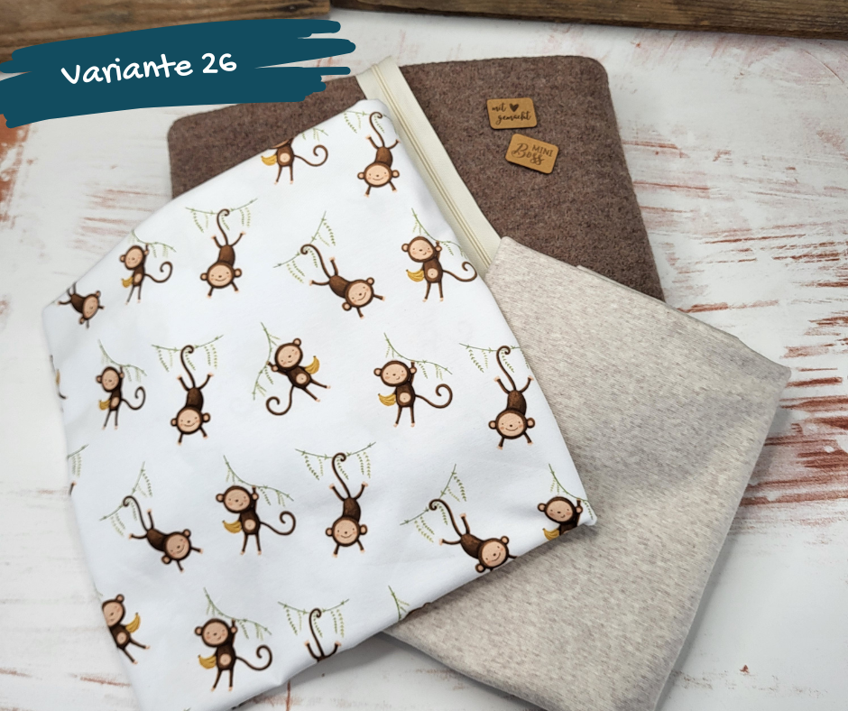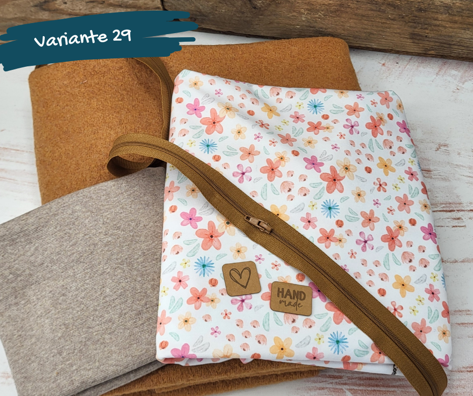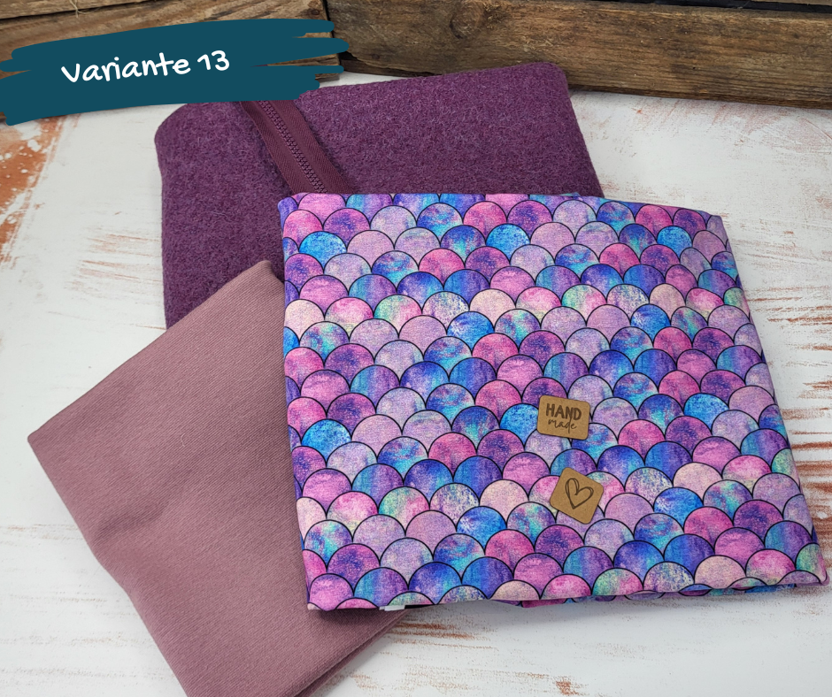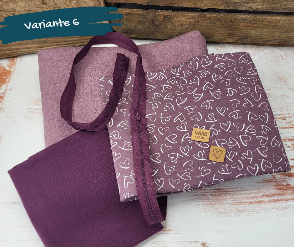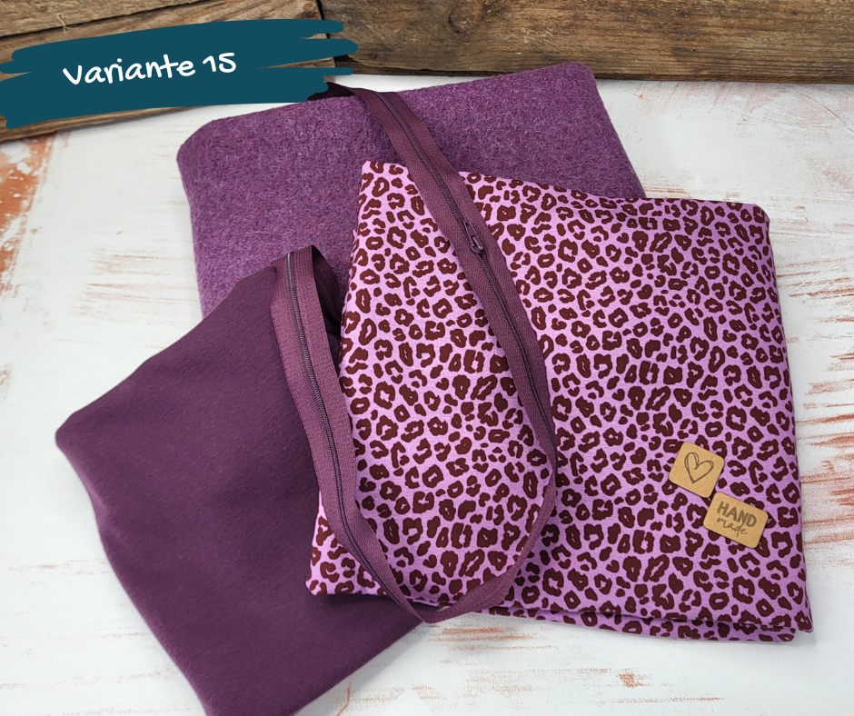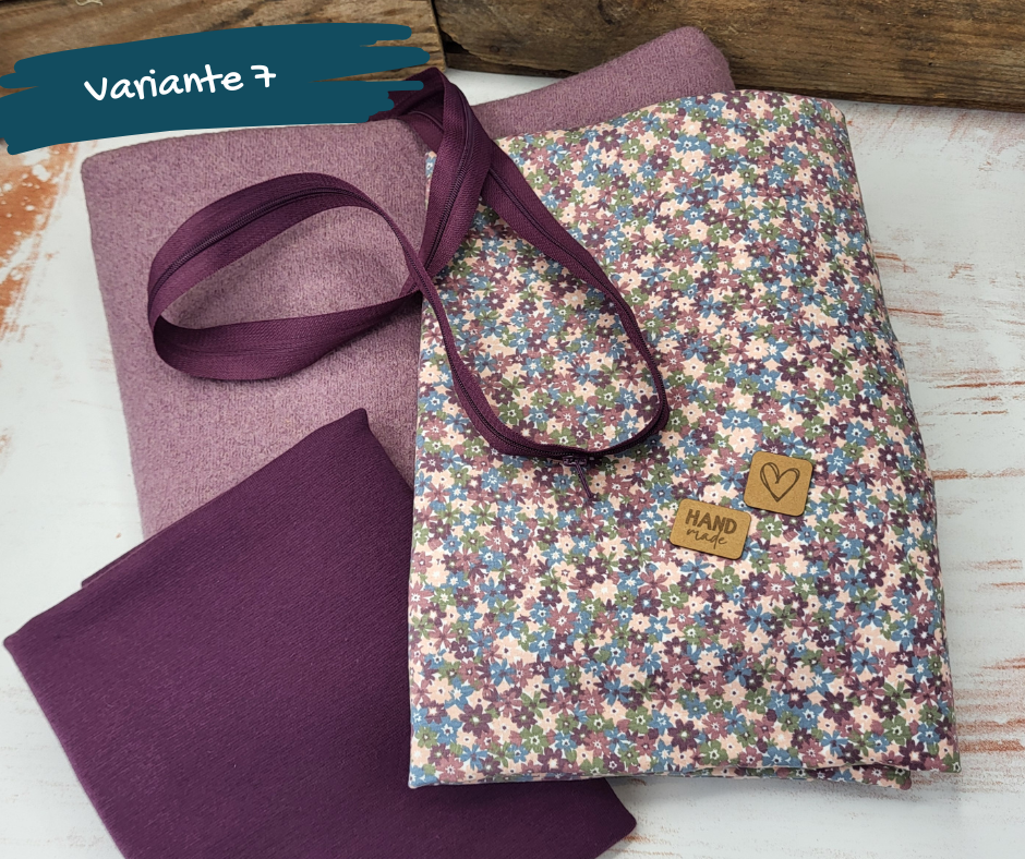 In den Paketen sind die passende Menge gekochte Wolle (380g/m²), Jerseystoff, Bündchen und ein Endlosreißverschluss enthalten.
