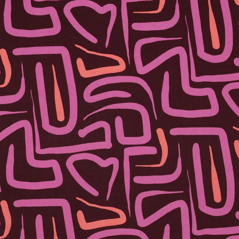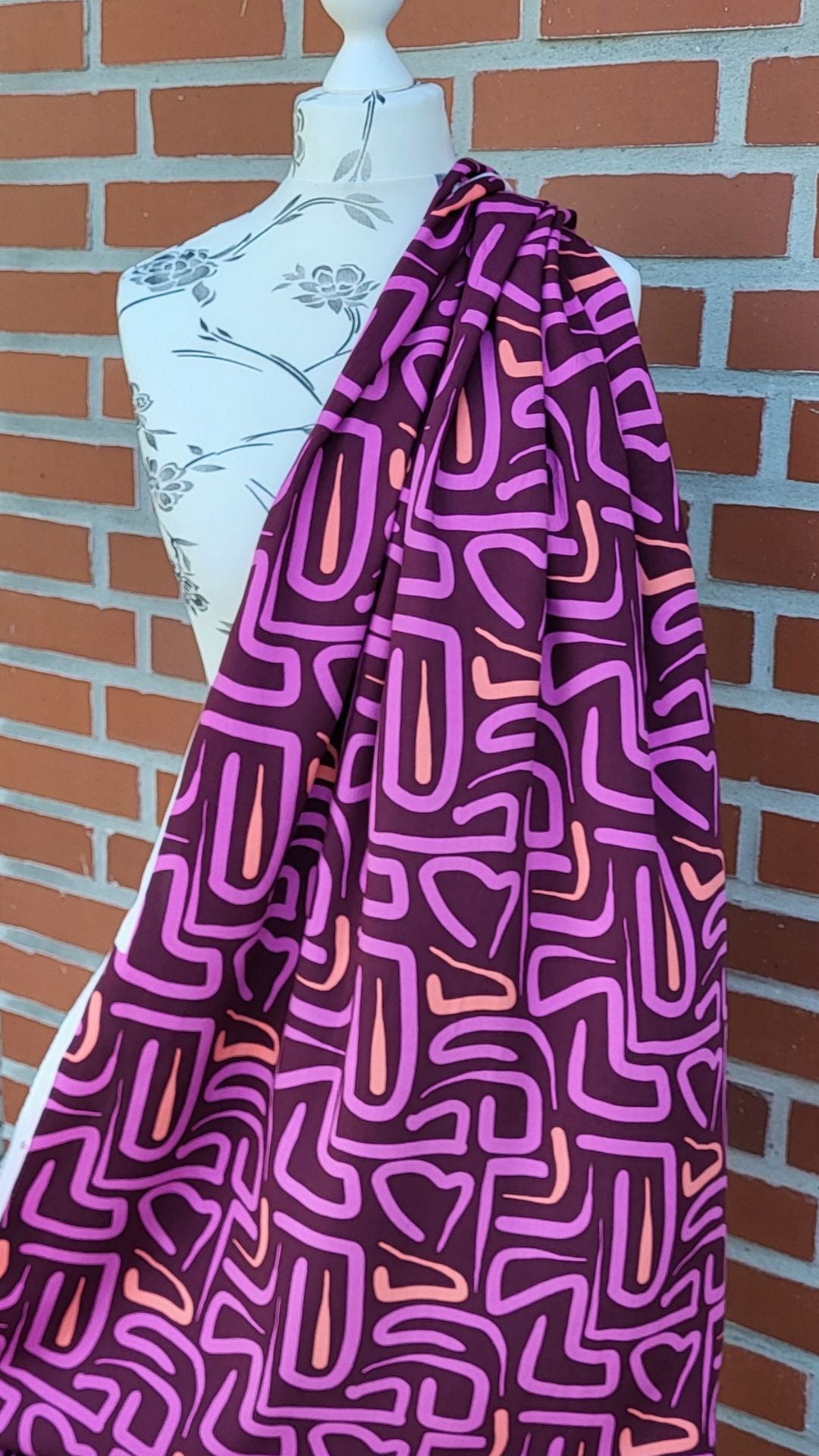 Dieser Viskose Stoff begeistert mit einem modernen, abstrakten Muster in zarten Rosa- und kräftigen Orangetönen auf einem tief beerigen Hintergrund.